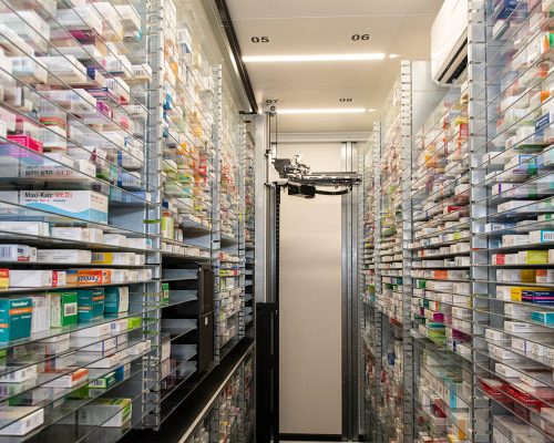 Unterstützt werden wir dabei von einem hochmodernen Kommissionierautomaten, der bis zu 10.000 Arzneimittelpackungen temperaturkontrolliert lagern kann.