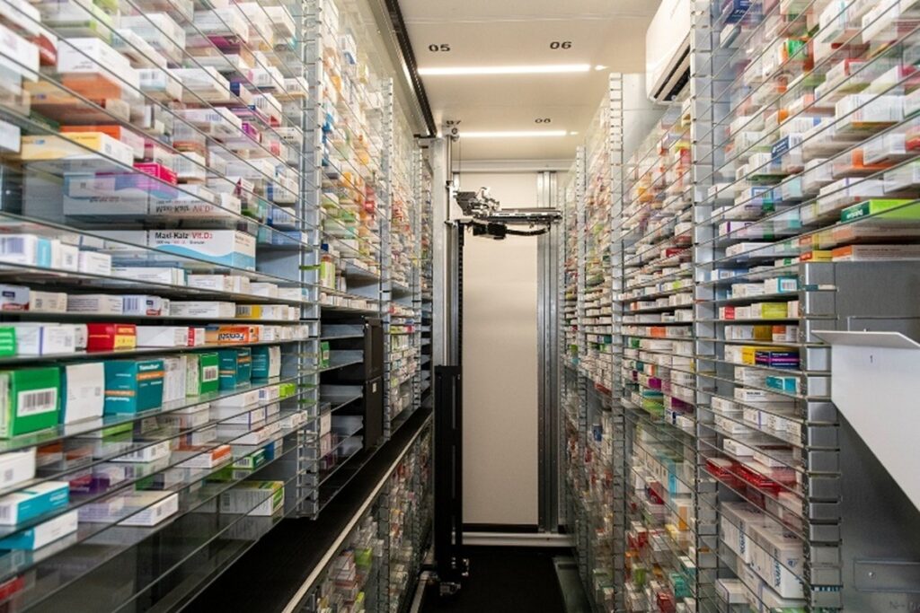 Unterstützt werden wir dabei von einem hochmodernen Kommissionierautomaten, der bis zu 10.000 Arzneimittelpackungen temperaturkontrolliert lagern kann.